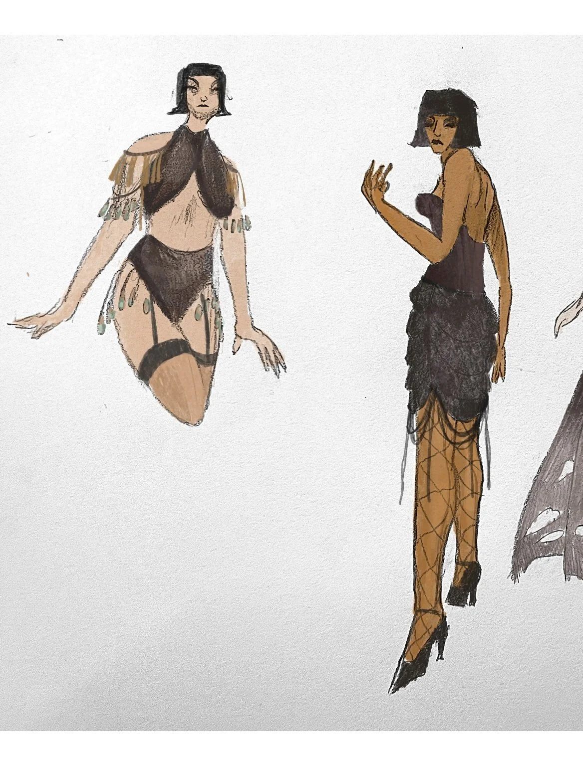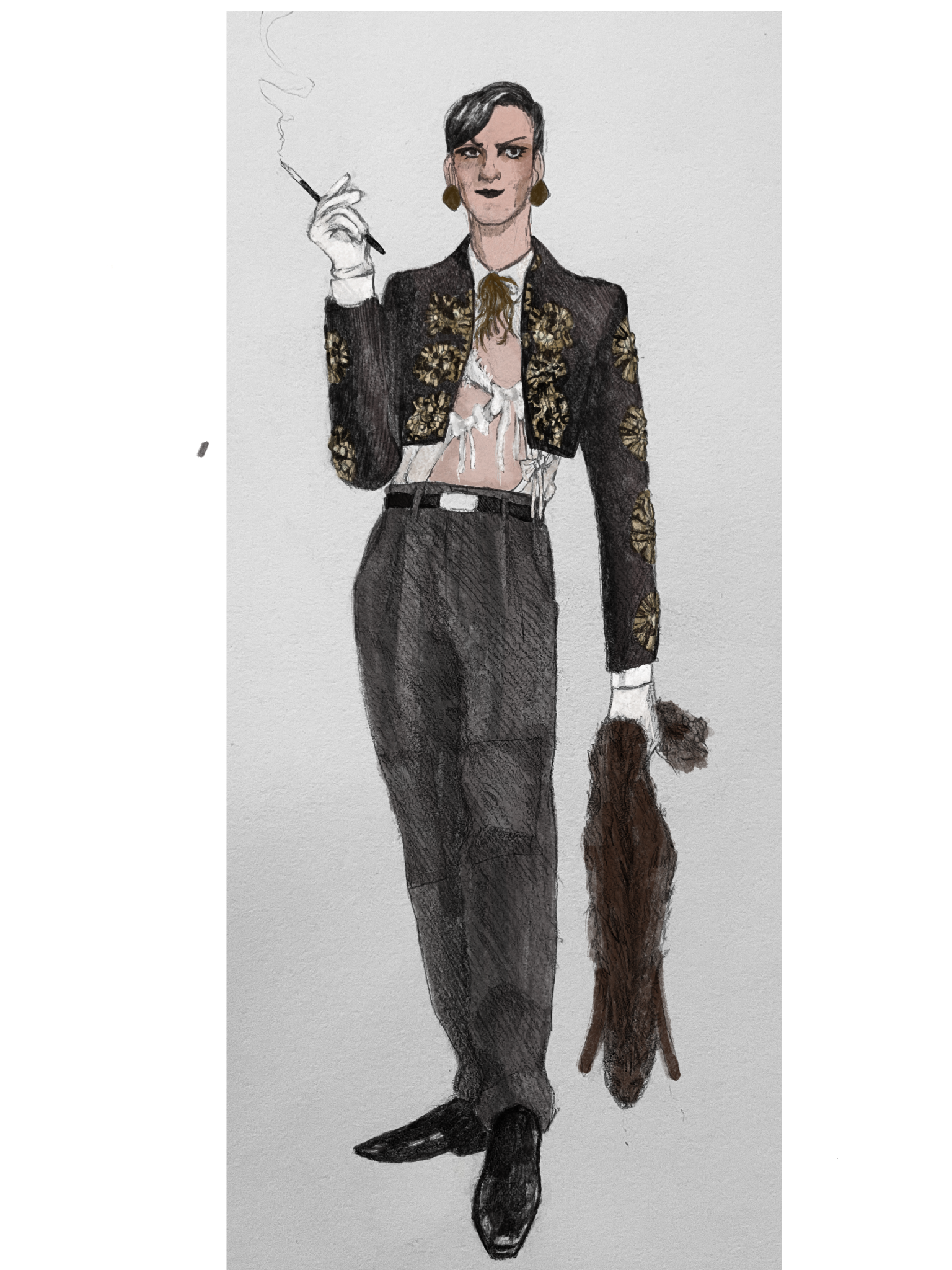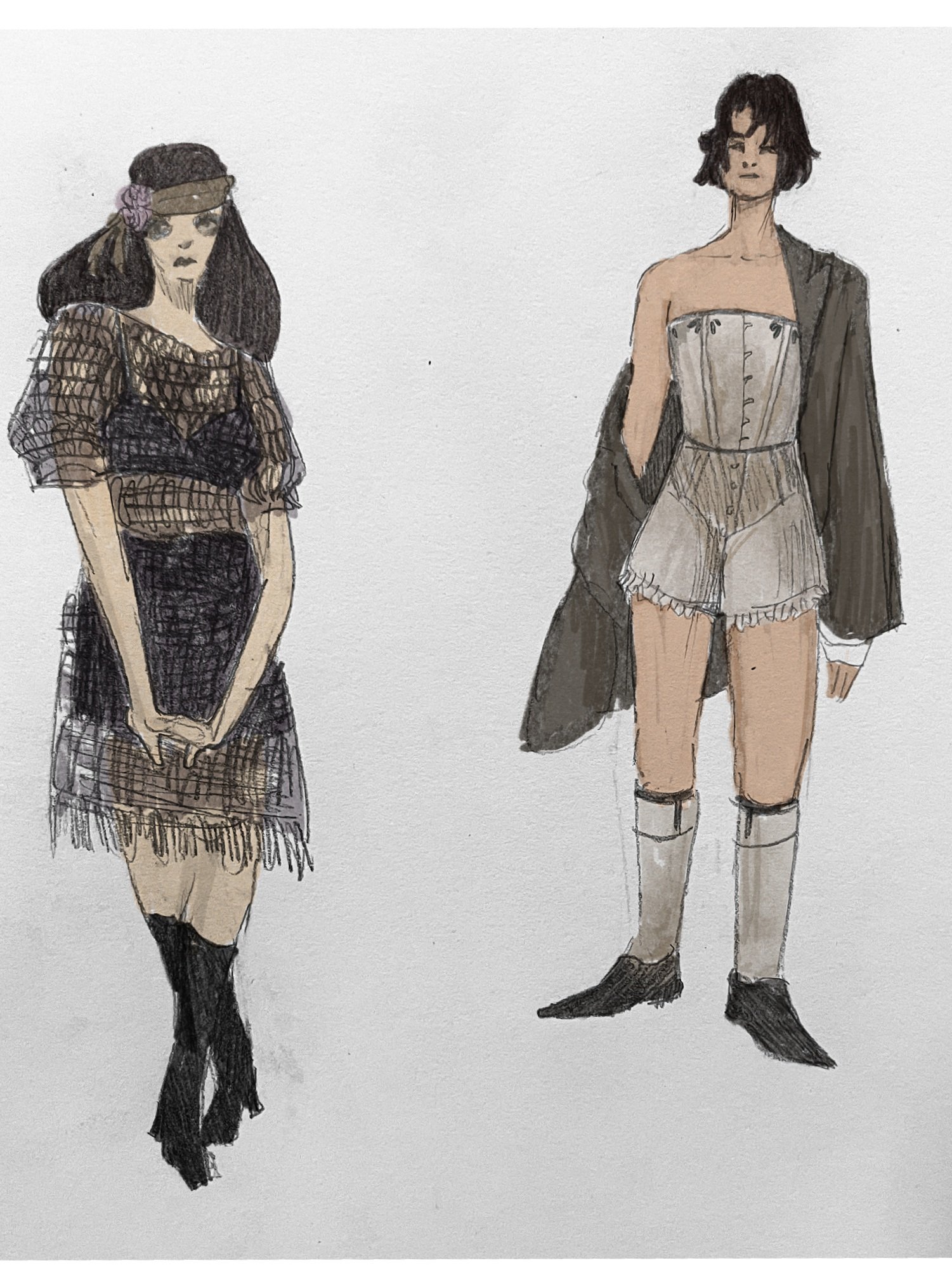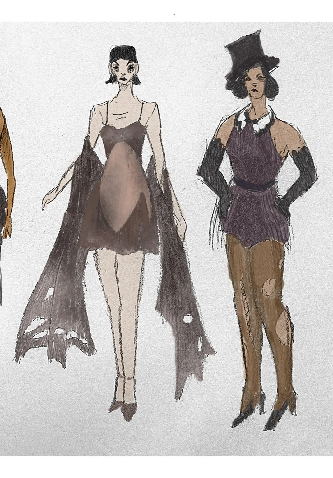 This production of Joe Masteroff’s Cabaret was directed by Andre Garner and David T. Little, drawing on the idea of the luring seduction of fascism. In this production the Emcee draws the audience into a world of violence that they cannot see until it is too late. I wanted to use the color red to symbolize that a character has sympathy to fascist ideology, so as the show progresses some characters begin to wear red accessories. Many of my costume designs for this show were based on “degenerate art,” art that was not deemed suitable by the Nazi regime. Often this “degenerate art” was by and including Queer people, which felt suitable for the story of Cabaret.